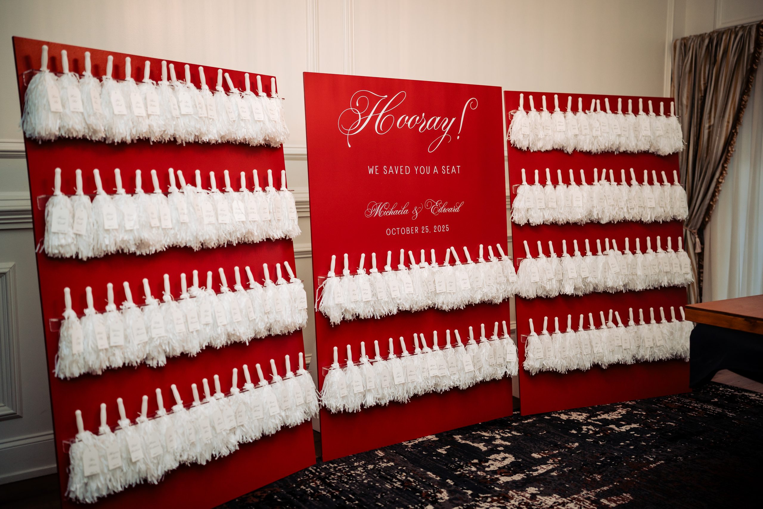 Couples are reimagining seating arrangements with fun, interactive displays that make finding your spot part of the celebration. From cascading escort card walls and hanging installations to custom calligraphy on mirrors or greenery boards, these displays are as beautiful as they are functional. Guests love engaging with the design, snapping photos, and feeling personally welcomed — turning a practical detail into a memorable, Instagram-worthy moment.