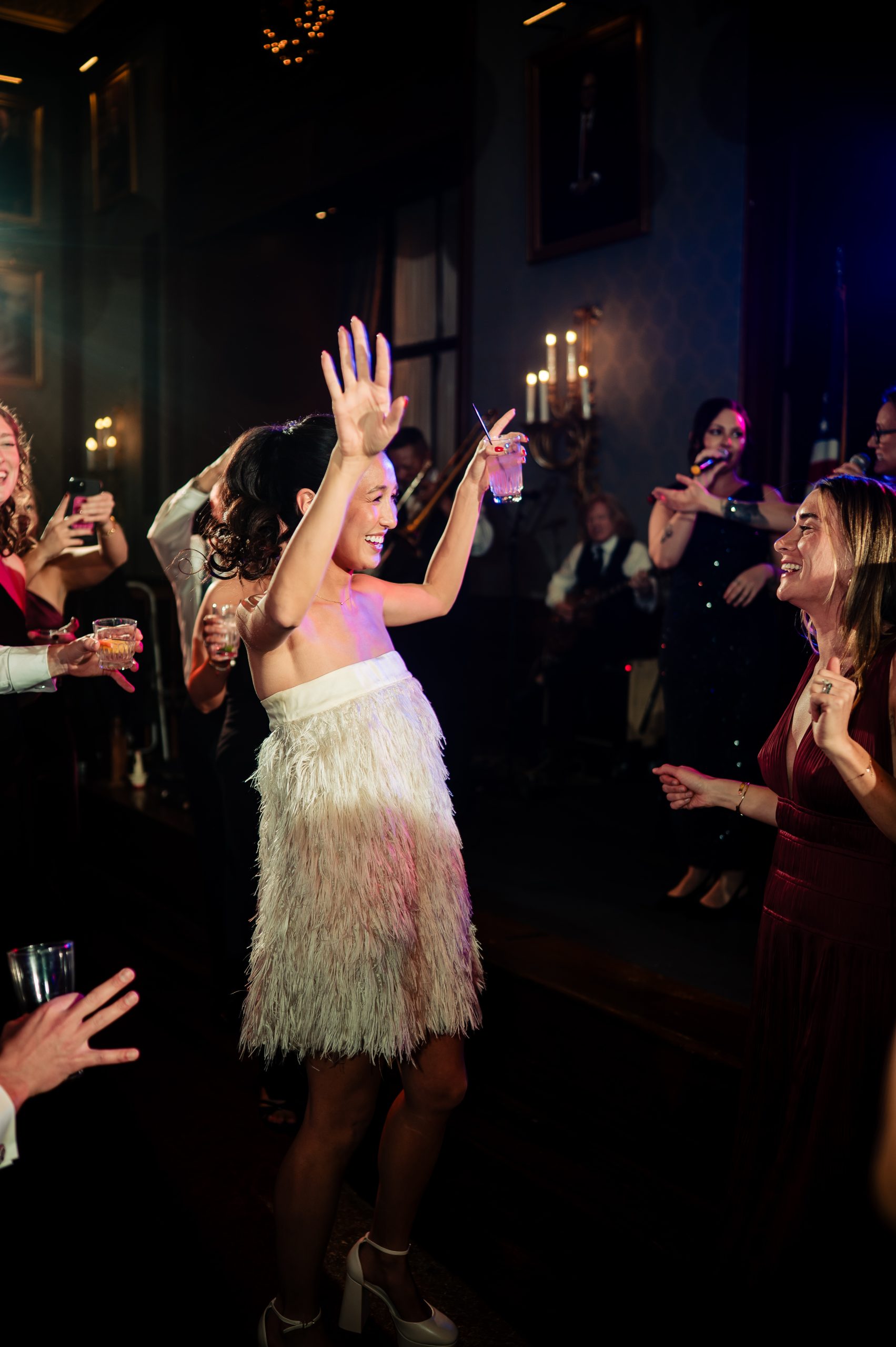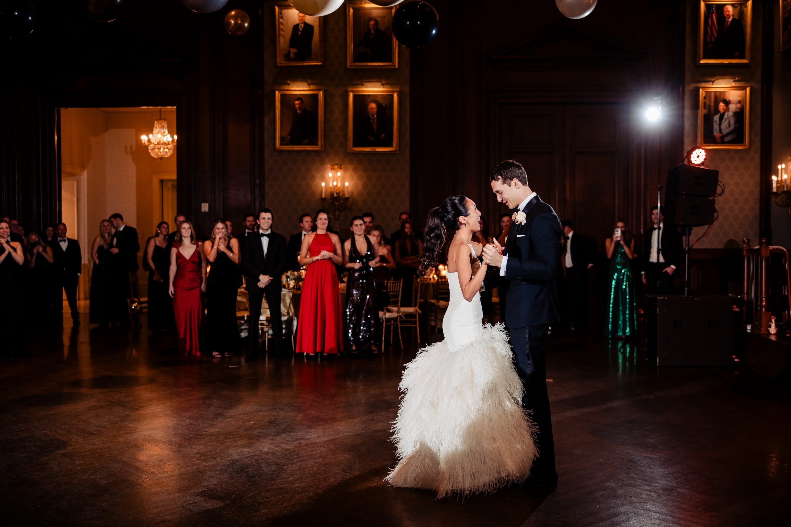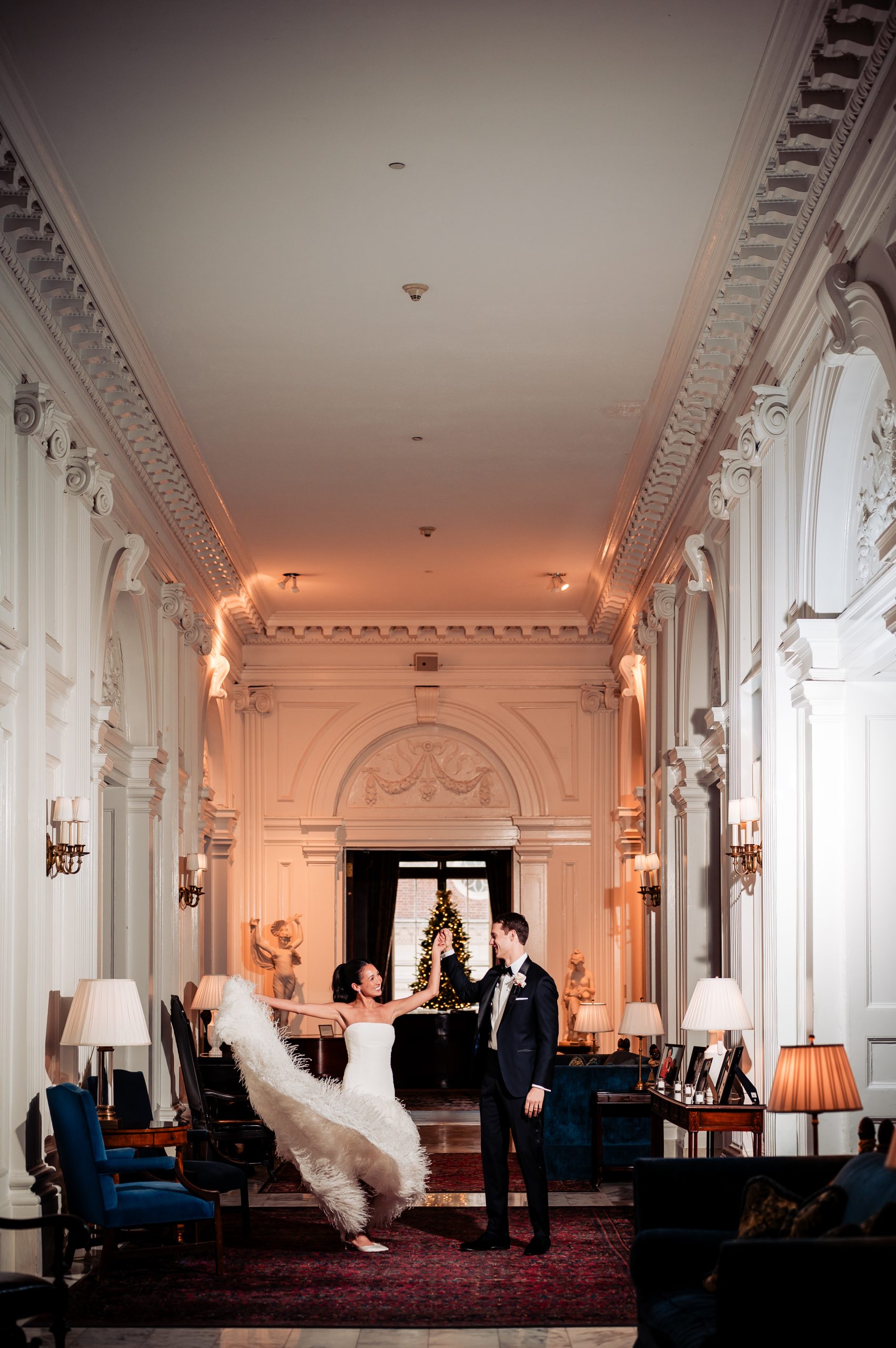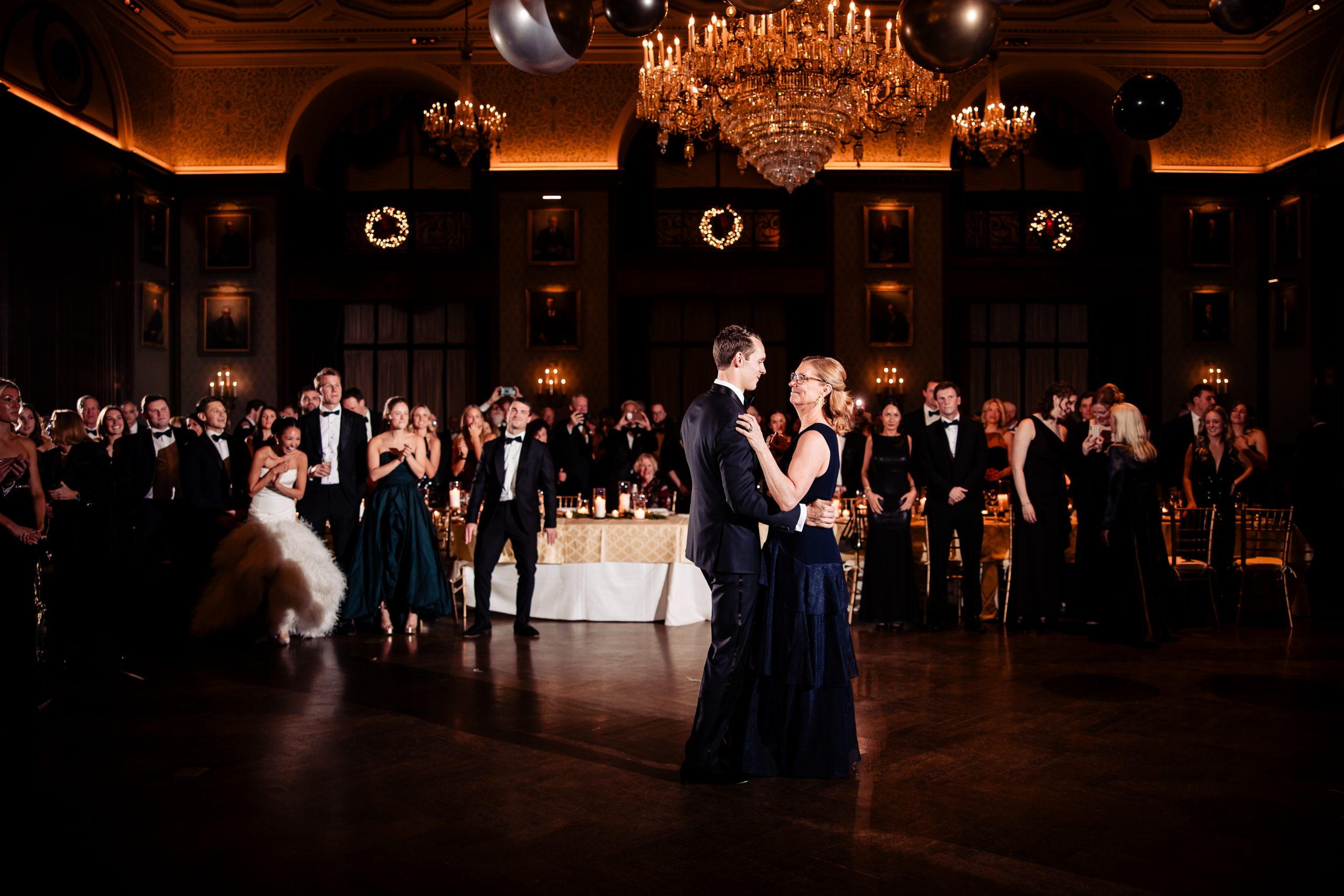 Guests were welcomed into cocktail hour in the Union League’s Lincoln Room, where the celebration began with an atmosphere of classic sophistication and festive anticipation. Before guests arrived, we captured Alexis and Scott sharing a few quiet moments alone in the reception space, along with photographs of the thoughtfully designed room and its details — a calm pause before the night truly unfolded.