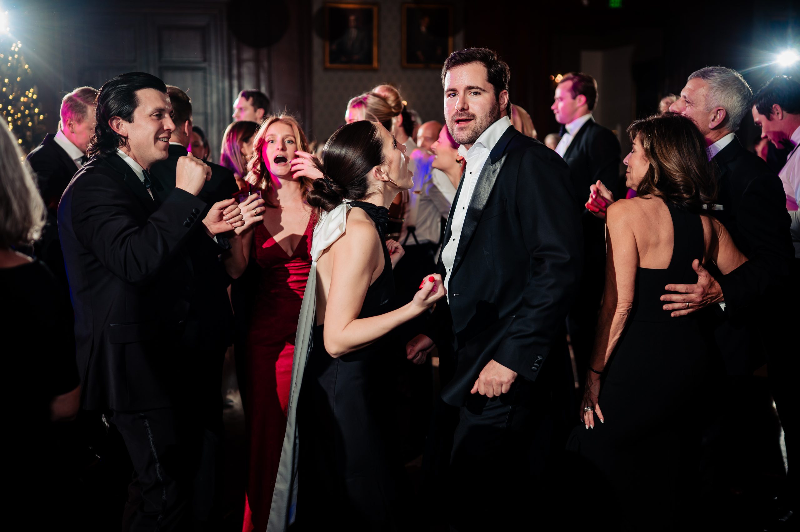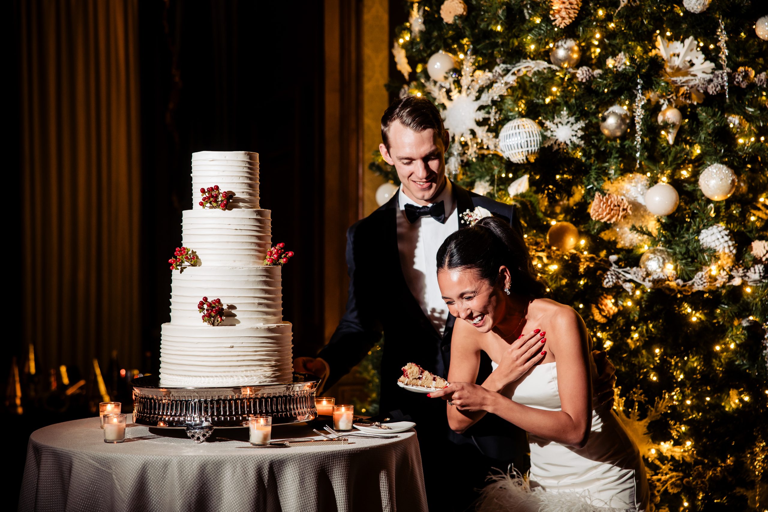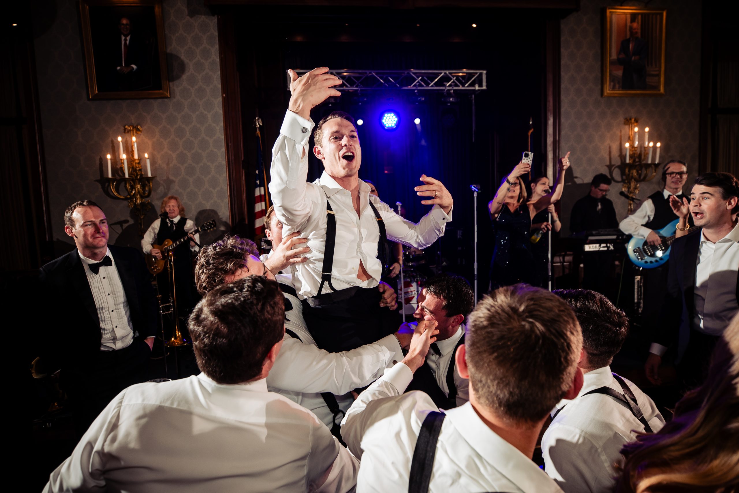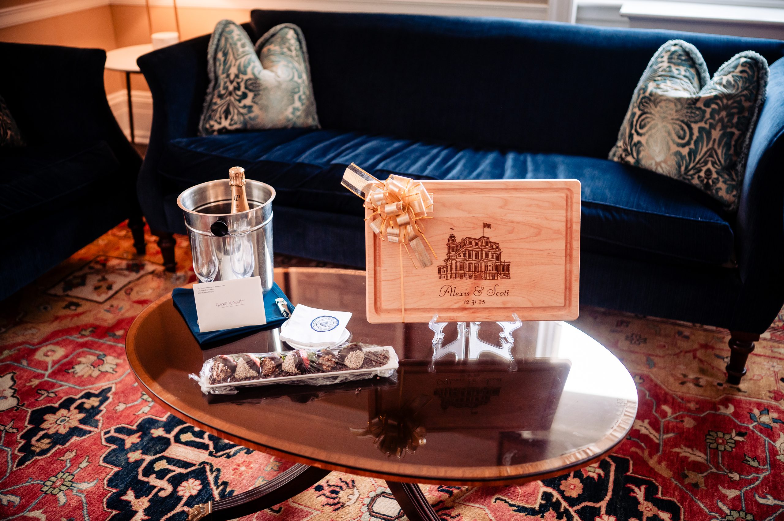 Guests were welcomed into cocktail hour in the Union League’s Lincoln Room, where the celebration began with an atmosphere of classic sophistication and festive anticipation. Before guests arrived, we captured Alexis and Scott sharing a few quiet moments alone in the reception space, along with photographs of the thoughtfully designed room and its details — a calm pause before the night truly unfolded.
