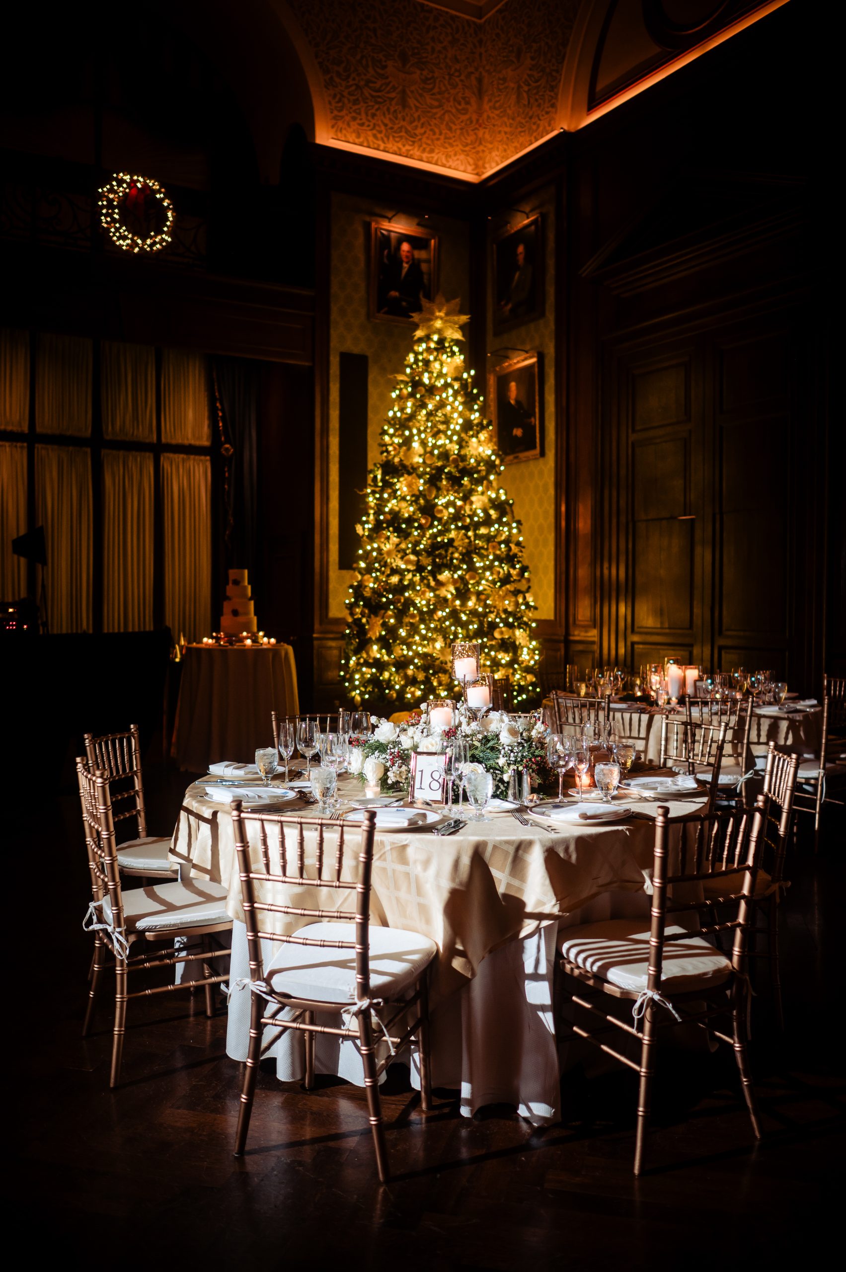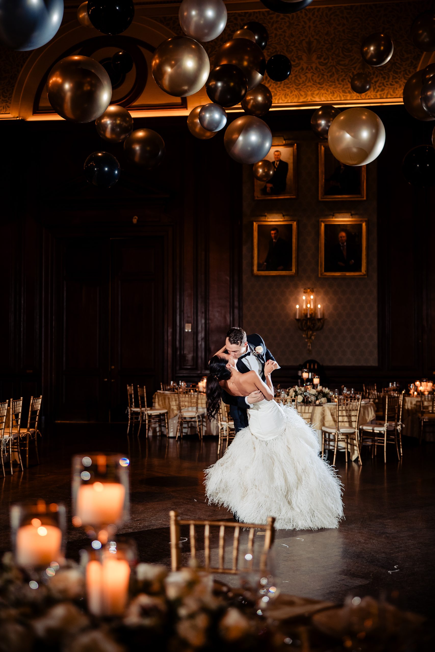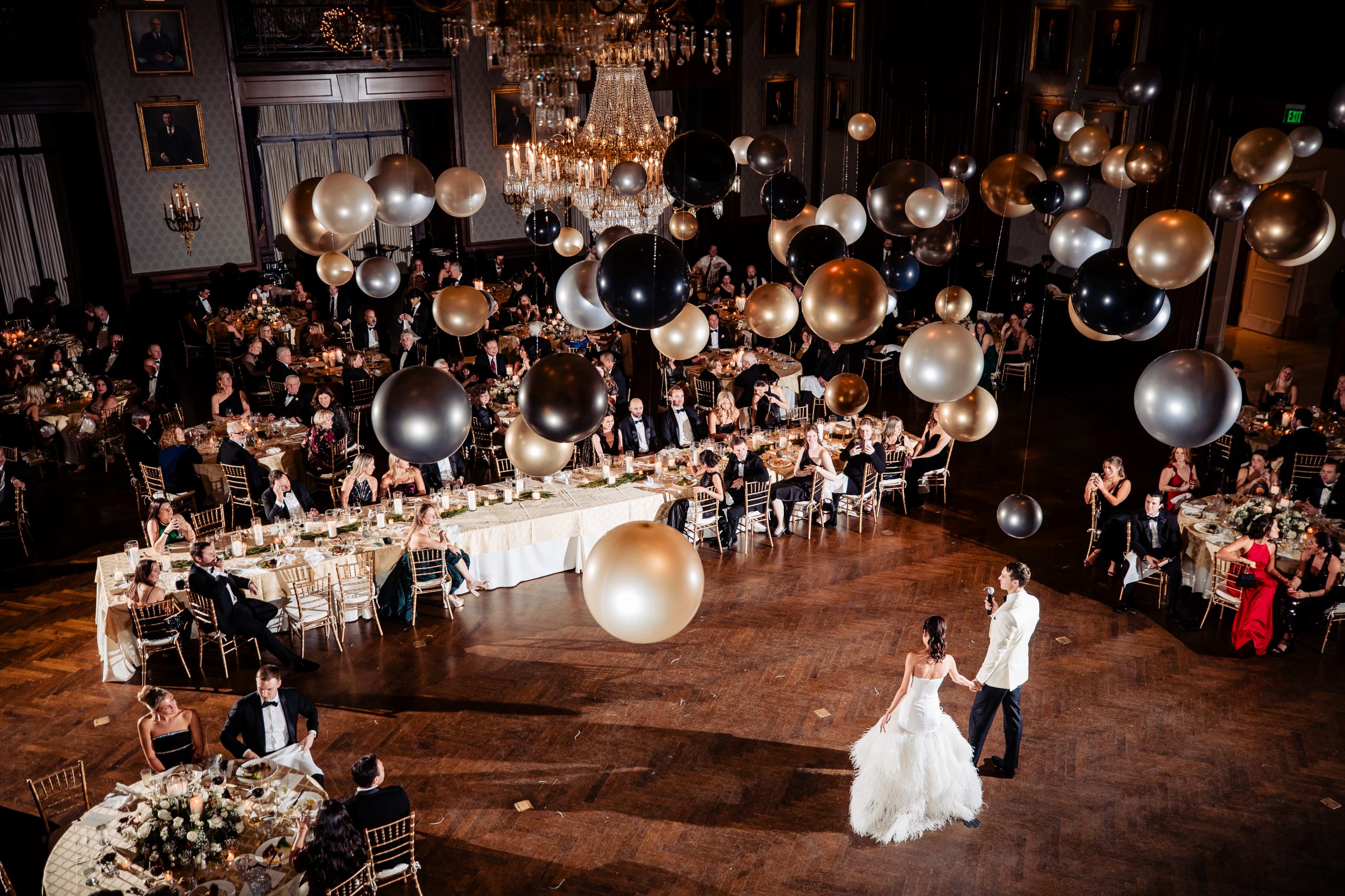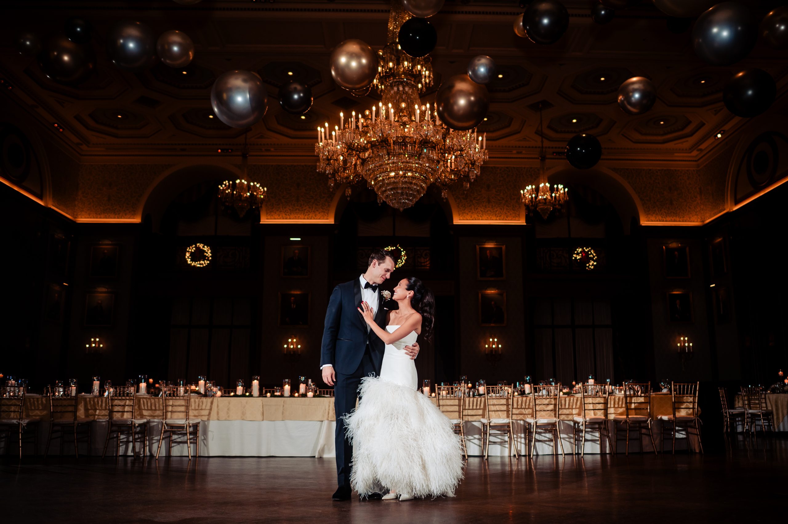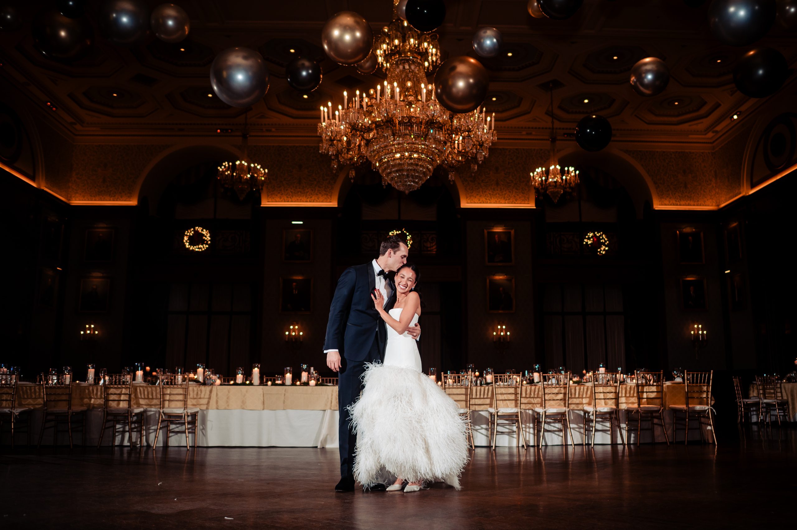 Following cocktail hour, guests moved into the Union League’s ballroom for the reception. Cream linens, gold chairs, and flickering candlelight created a warm and inviting setting. The black-tie dress code paired with metallic accents gave the evening a subtle Gatsby-inspired feel, perfectly in tune with the excitement of New Year’s Eve.