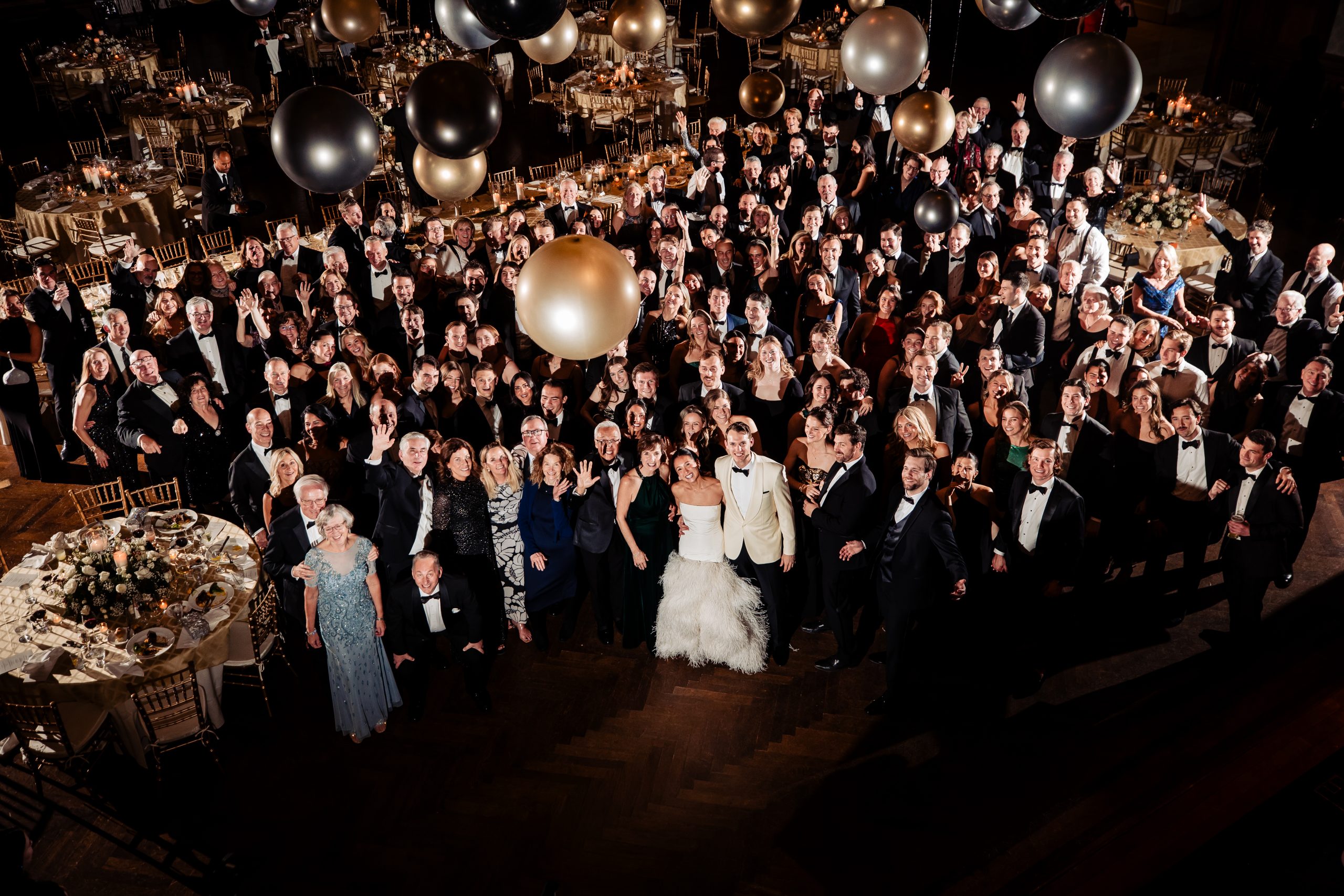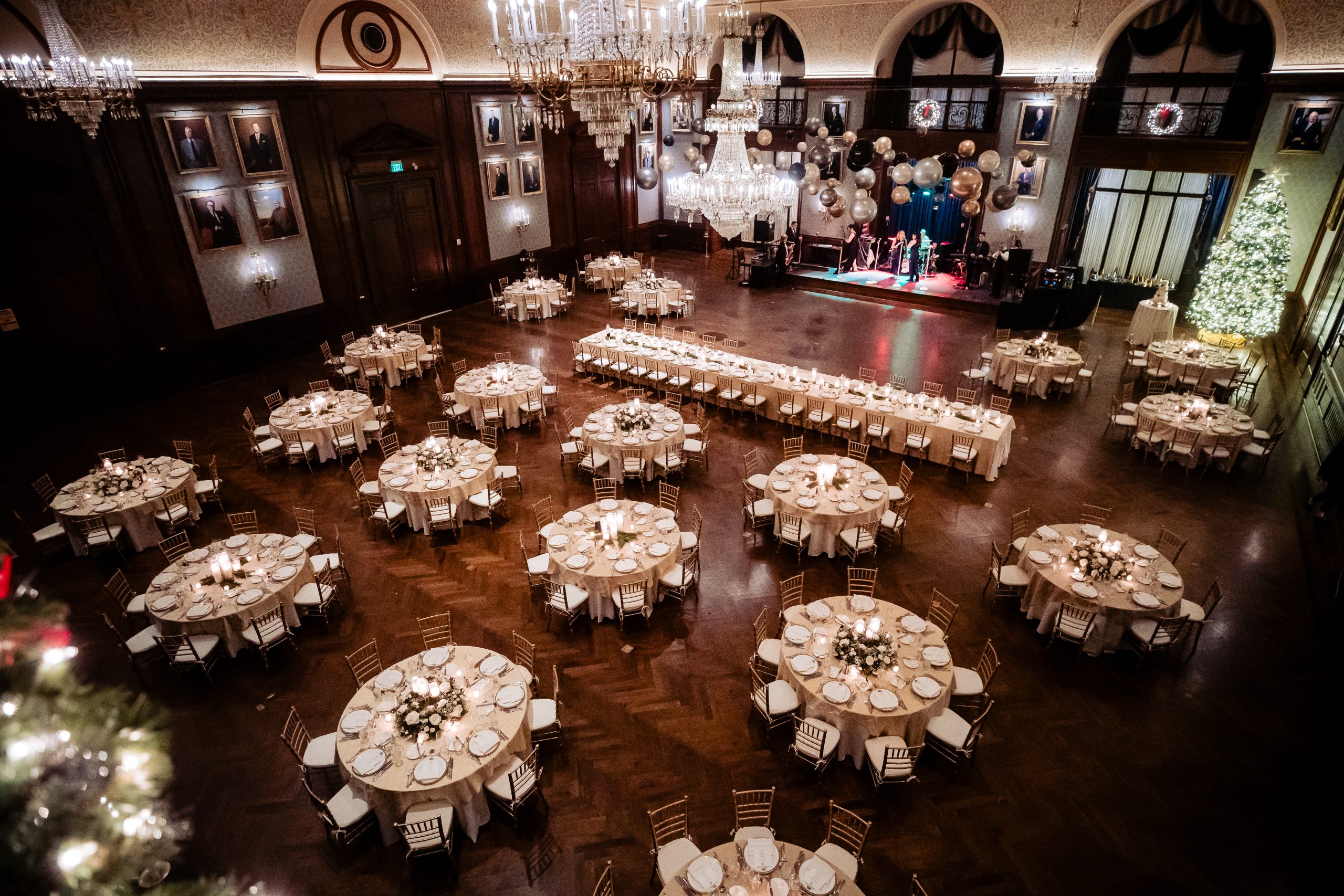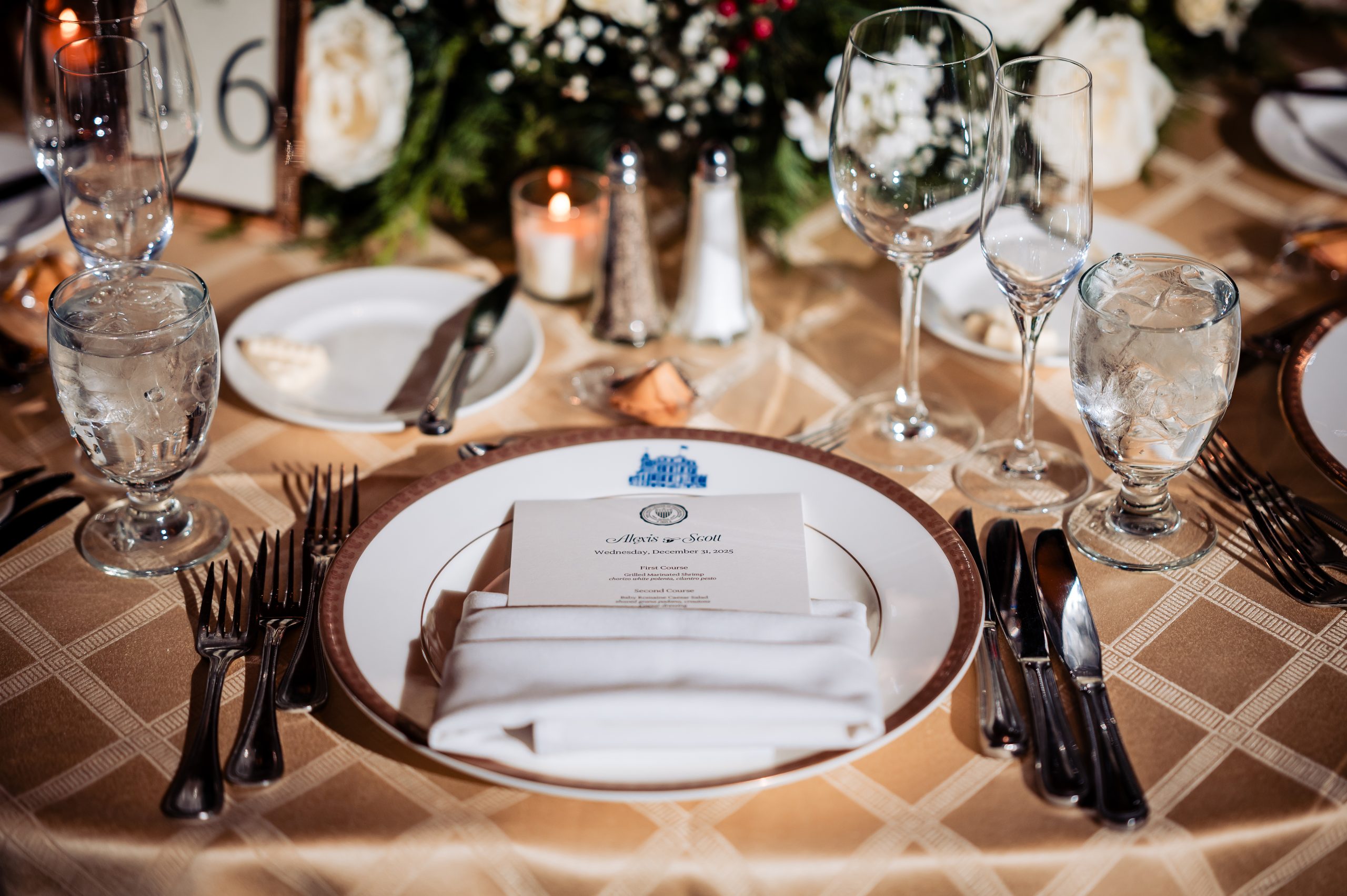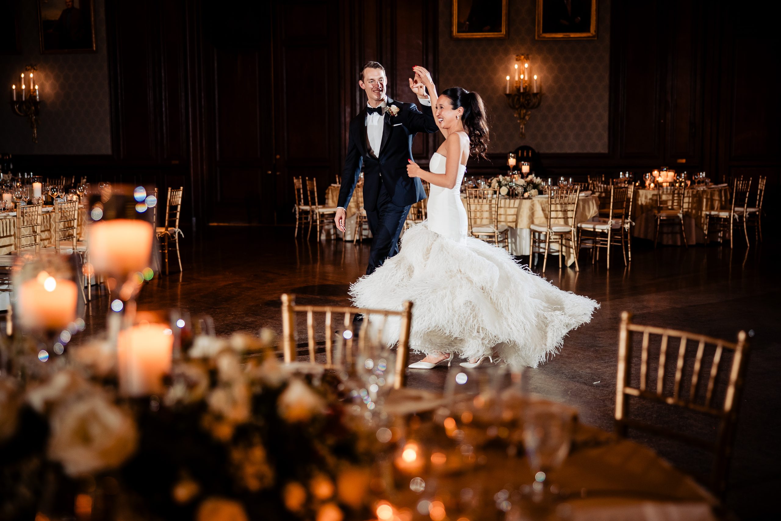 Following cocktail hour, guests moved into the Union League’s ballroom for the reception. Cream linens, gold chairs, and flickering candlelight created a warm and inviting setting. The black-tie dress code paired with metallic accents gave the evening a subtle Gatsby-inspired feel, perfectly in tune with the excitement of New Year’s Eve.