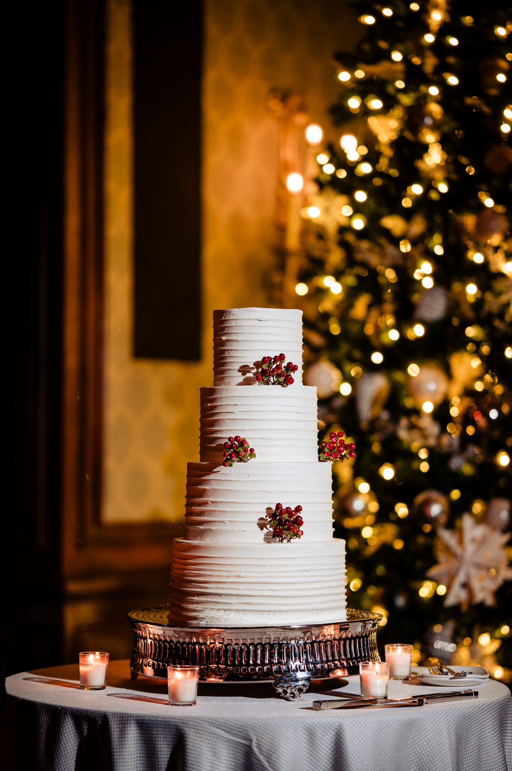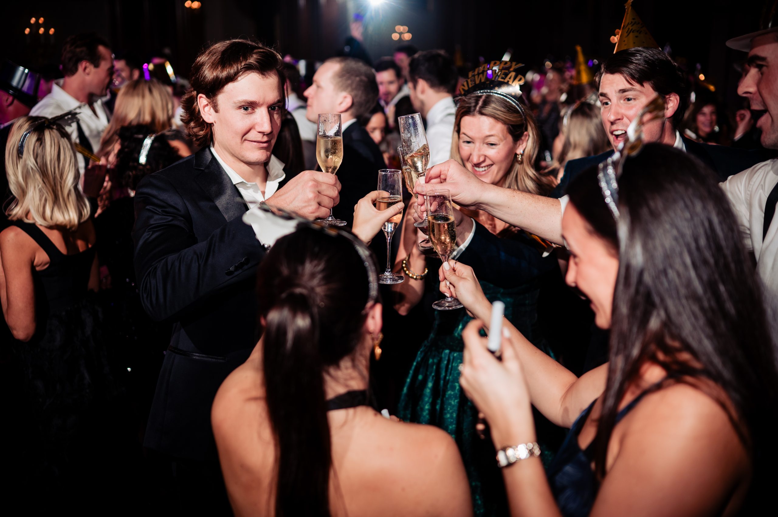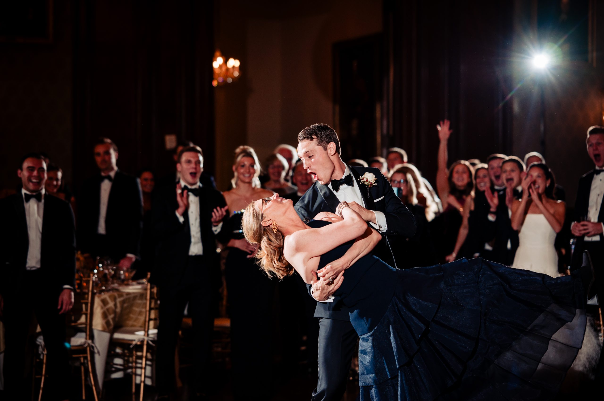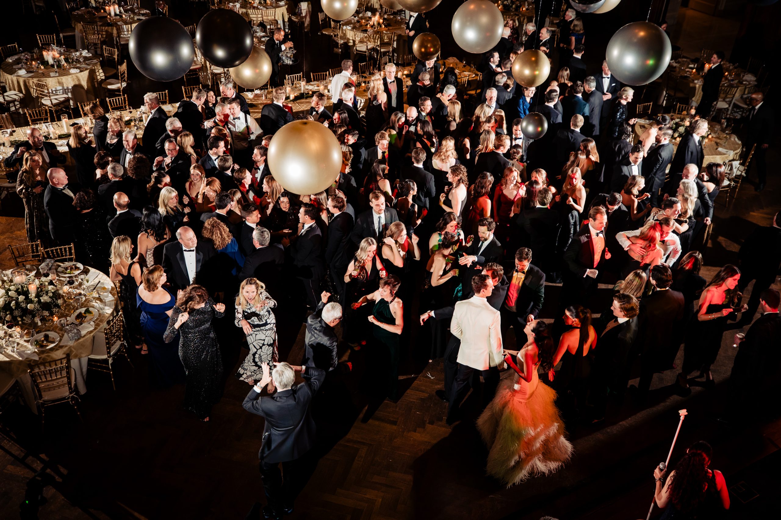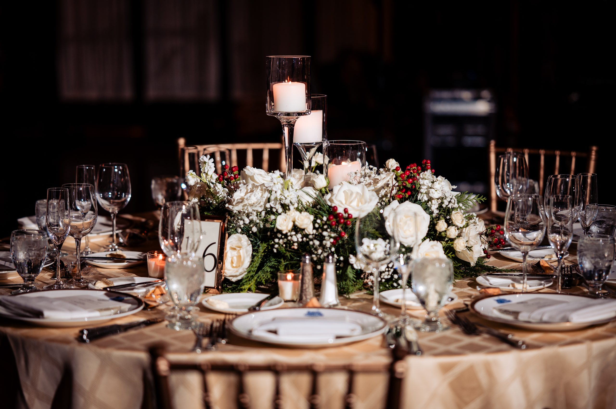 Following cocktail hour, guests moved into the Union League’s ballroom for the reception. Cream linens, gold chairs, and flickering candlelight created a warm and inviting setting. The black-tie dress code paired with metallic accents gave the evening a subtle Gatsby-inspired feel, perfectly in tune with the excitement of New Year’s Eve.