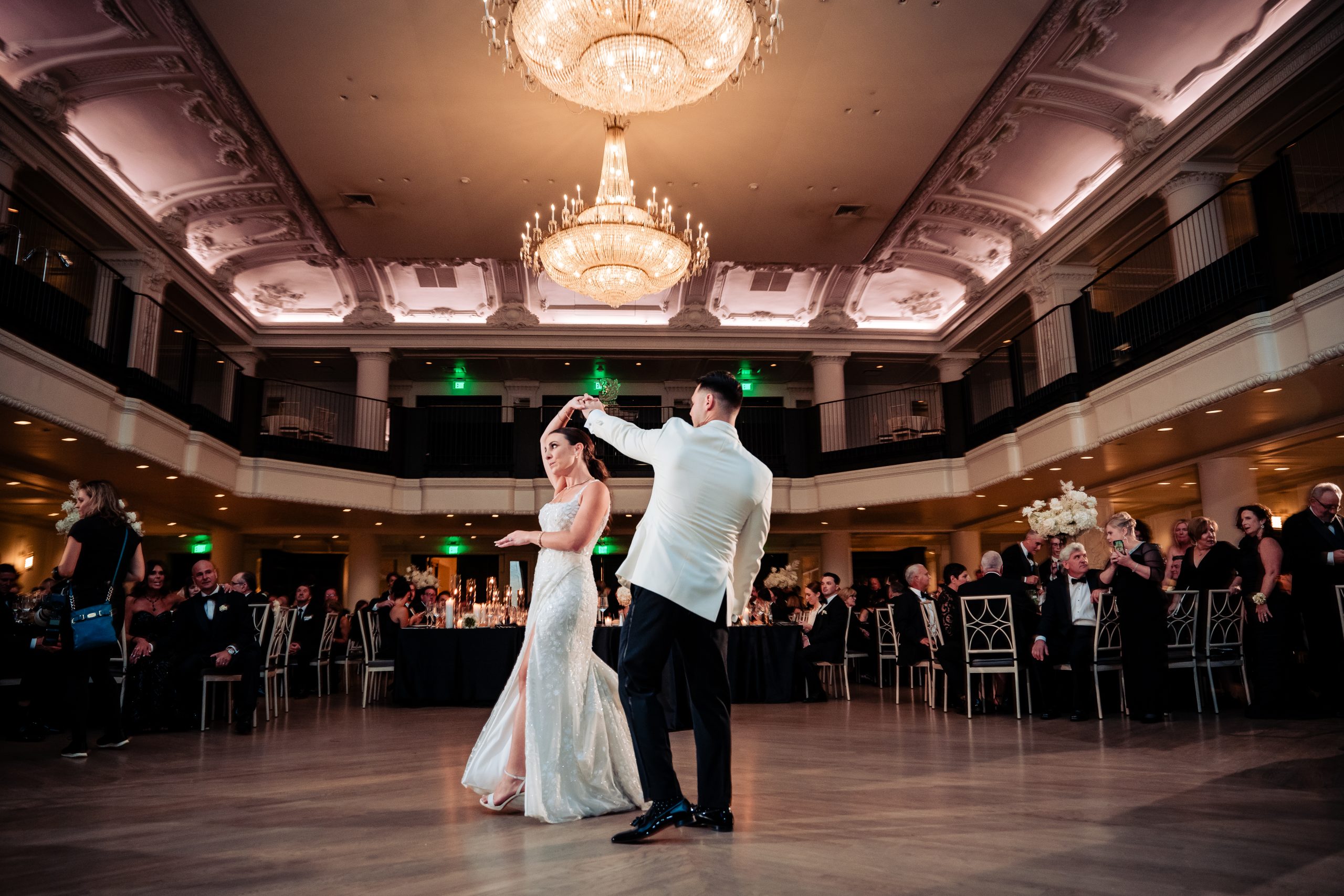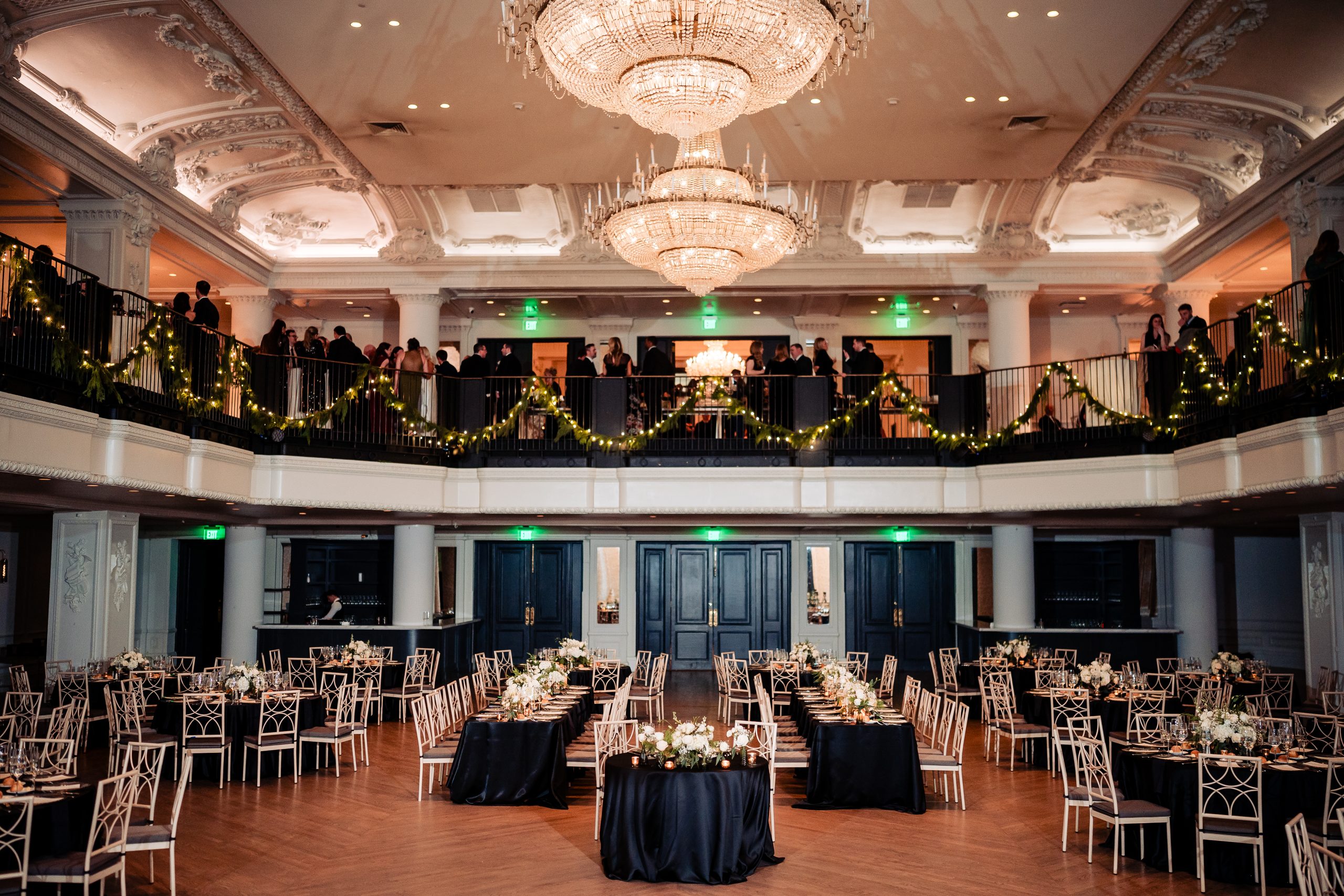 One of the most striking features of The Grand Belle is its breathtaking historic ballroom. The space reflects the grandeur of the Gilded Age, with intricate architectural details, dramatic ceilings, and sparkling chandeliers that create an unforgettable atmosphere for a wedding celebration. The scale and elegance of the room make every moment feel elevated, from the ceremony to the final dance of the night.