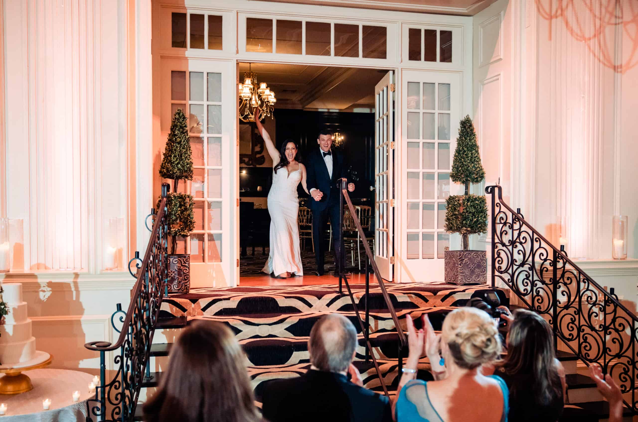 You and your guests can enjoy cocktails during Cescaphe’s signature cocktail hour-and-a-half in three locations: The Garden Courtyard, Lounge, and Main Cocktail room. The Garden Courtyard is the entryway to Cescaphe. If your wedding is during the winter months, your cocktails can be enjoyed in the Lounge. But the true star of the show is the Main Cocktail Room. With four balconies overlooking the Grand Ballroom, the space is truly a sight to behold. It includes a forty-foot mahogany food library with a chef-attended station, including choices of hors d’oeuvres. A customizable ice sculpture, full-service bar, and a raw bar will leave your guests truly in awe of the venue.
