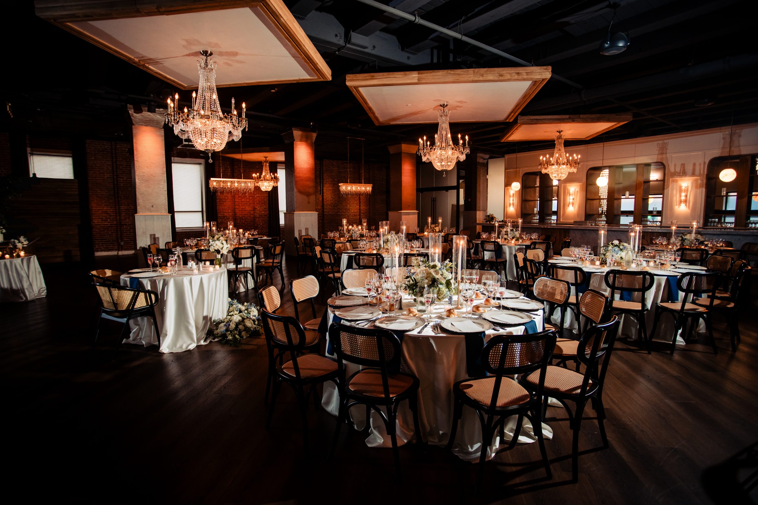 The renovation has breathed new life into Tendenza’s already impressive interior. The main ballroom, a focal point of the venue, now features a harmonious blend of exposed brick walls, floor-to-ceiling mirrors, black metals, brass accents, and vintage crystal chandeliers. This exquisite combination creates an ambiance that is both chic and inviting, perfect for hosting an unforgettable wedding.