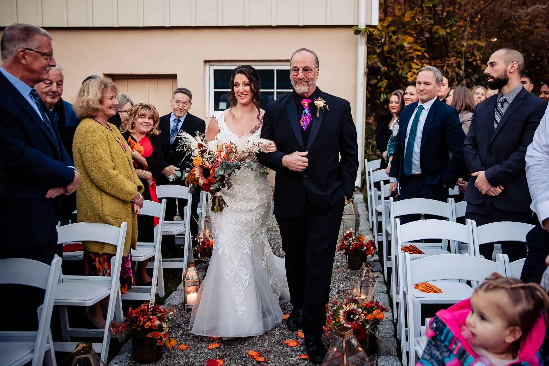 During golden hour, the couple said “I do” in their outdoor ceremony space. There were beautifully placed candles illuminating the path leading to the altar. The gentle rustling of leaves and the crisp autumn air added an extra layer of charm to the setting.