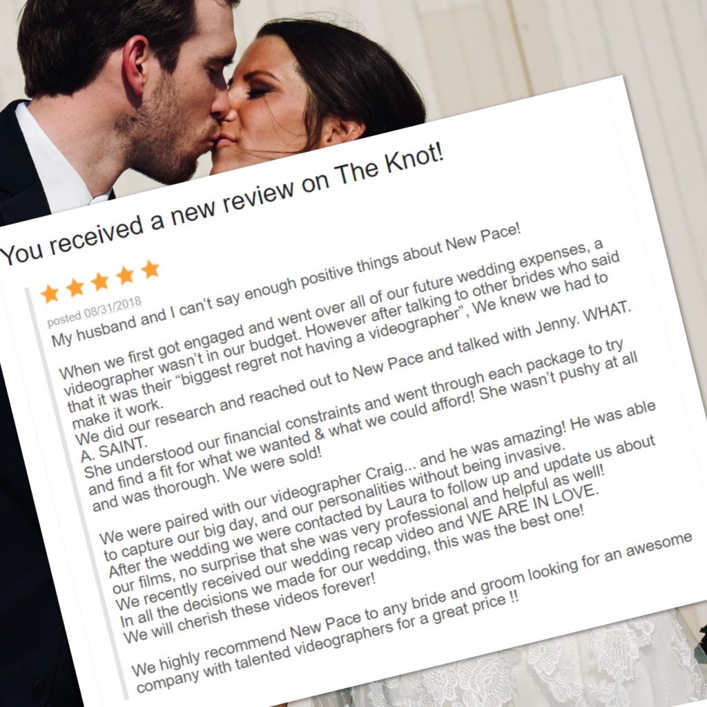 “If a picture is worth 1,000 words, how many is an epic wedding video? Probably 3.4 million. If you want the BEST of the BEST memory of your special day, go NO further. I planned my own wedding and New Pace by far HANDS DOWN was the easiest vendor to deal with. Talk about seamless communication and customer service. We received our video today, and I cannot stop watching it over and over! If you’re on a budget, don’t skimp on the video. I have so many friends whom told me, “don’t make the mistake I did, be sure to get a videographer”. I LISTENED and we now how the most amazing wedding video to last a lifetime! Look no further TRI-STATE area brides, these are your PEEPS!”