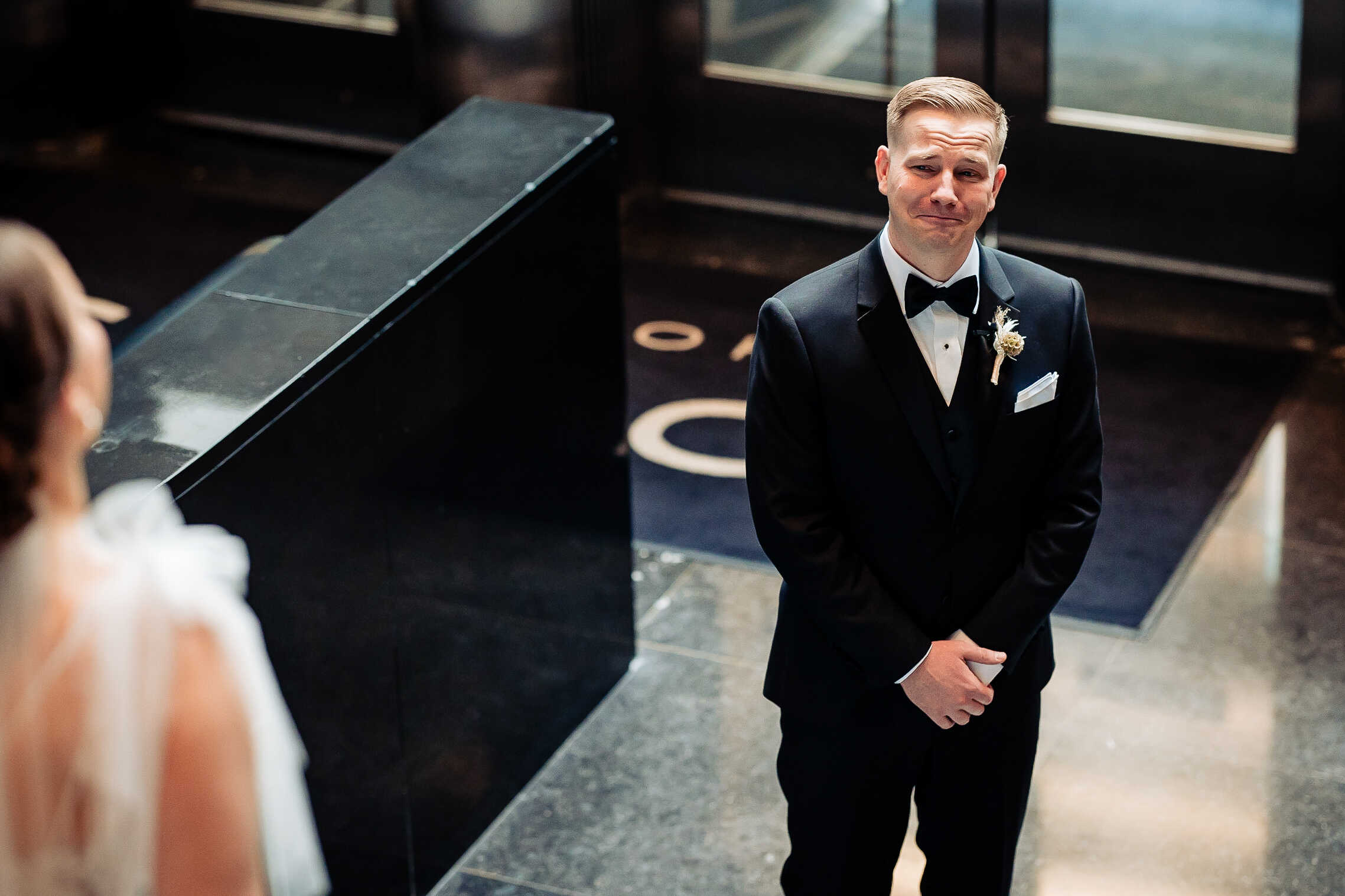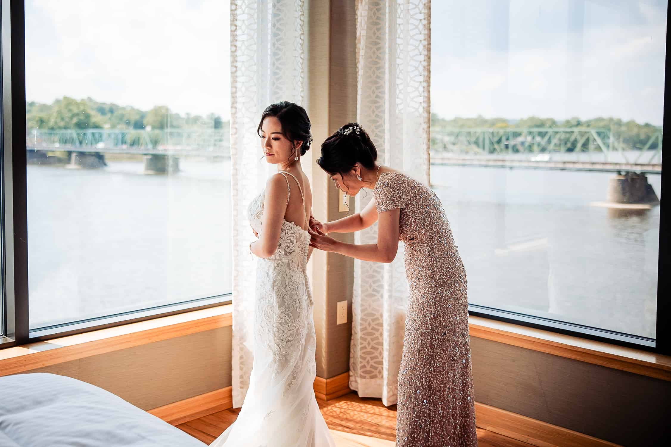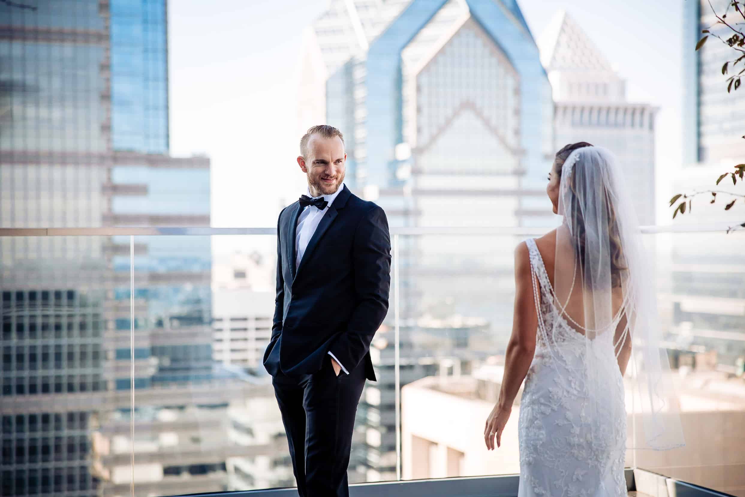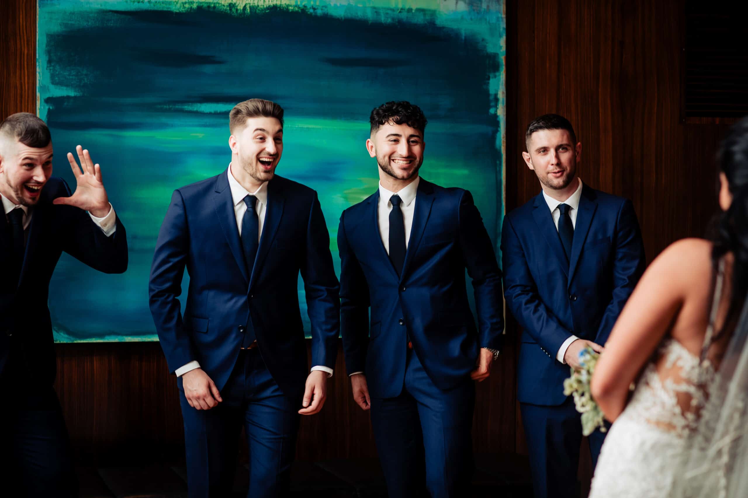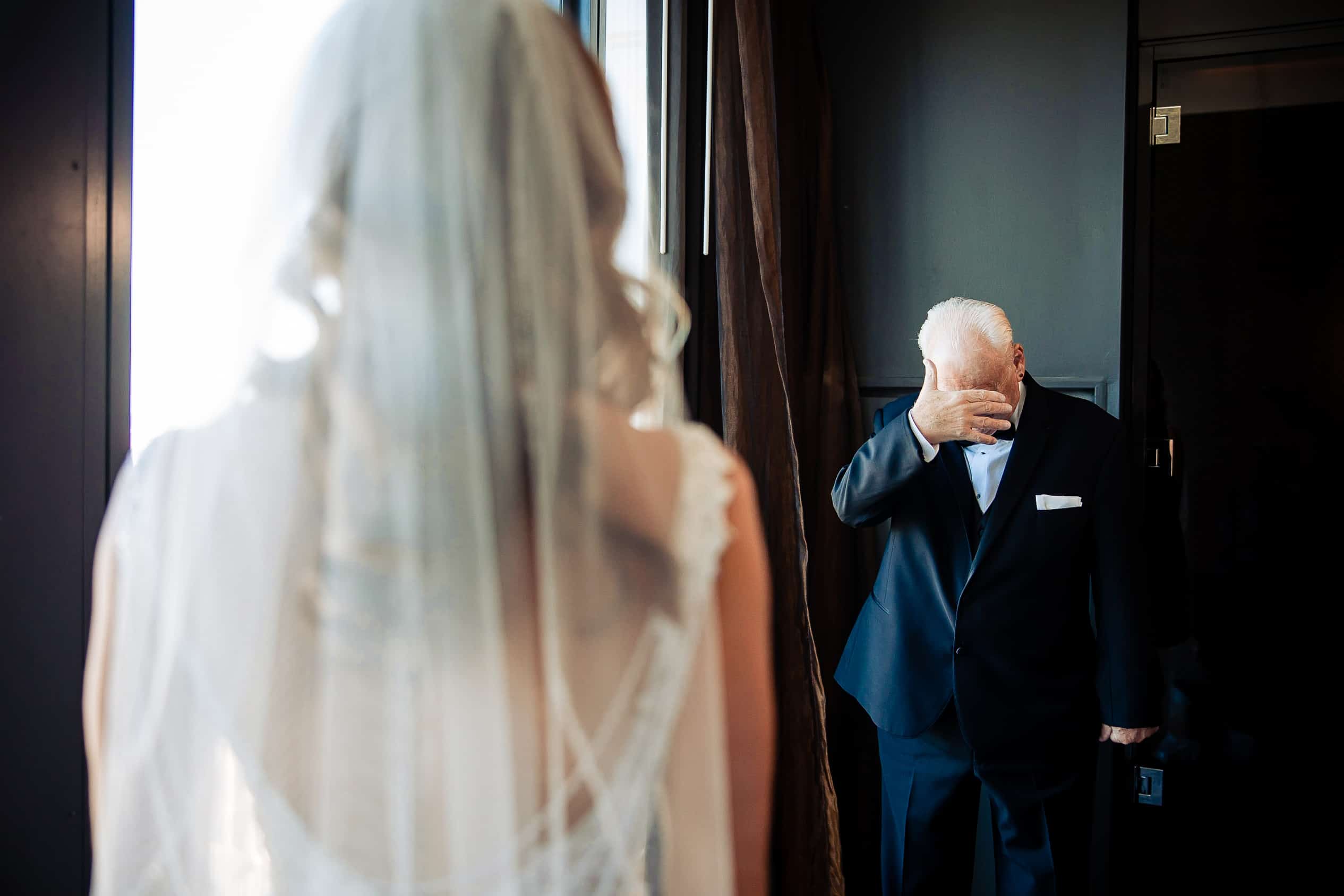 If you want a first look with your wedding party or family members during bride prep, choose a hotel suite that has more than one room to prevent delays. This ensures everyone can get ready simultaneously without seeing the bride until she’s ready for those first looks.