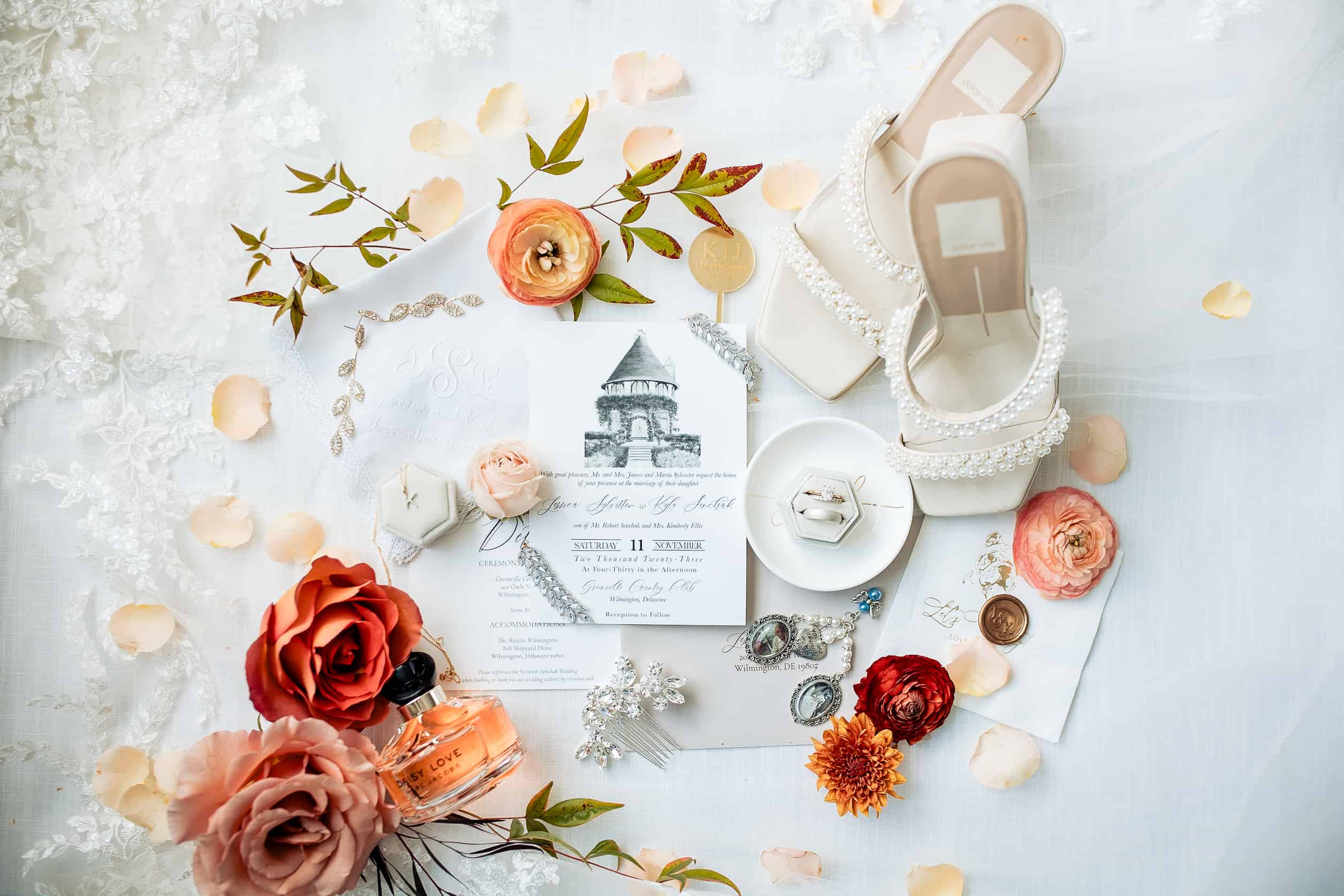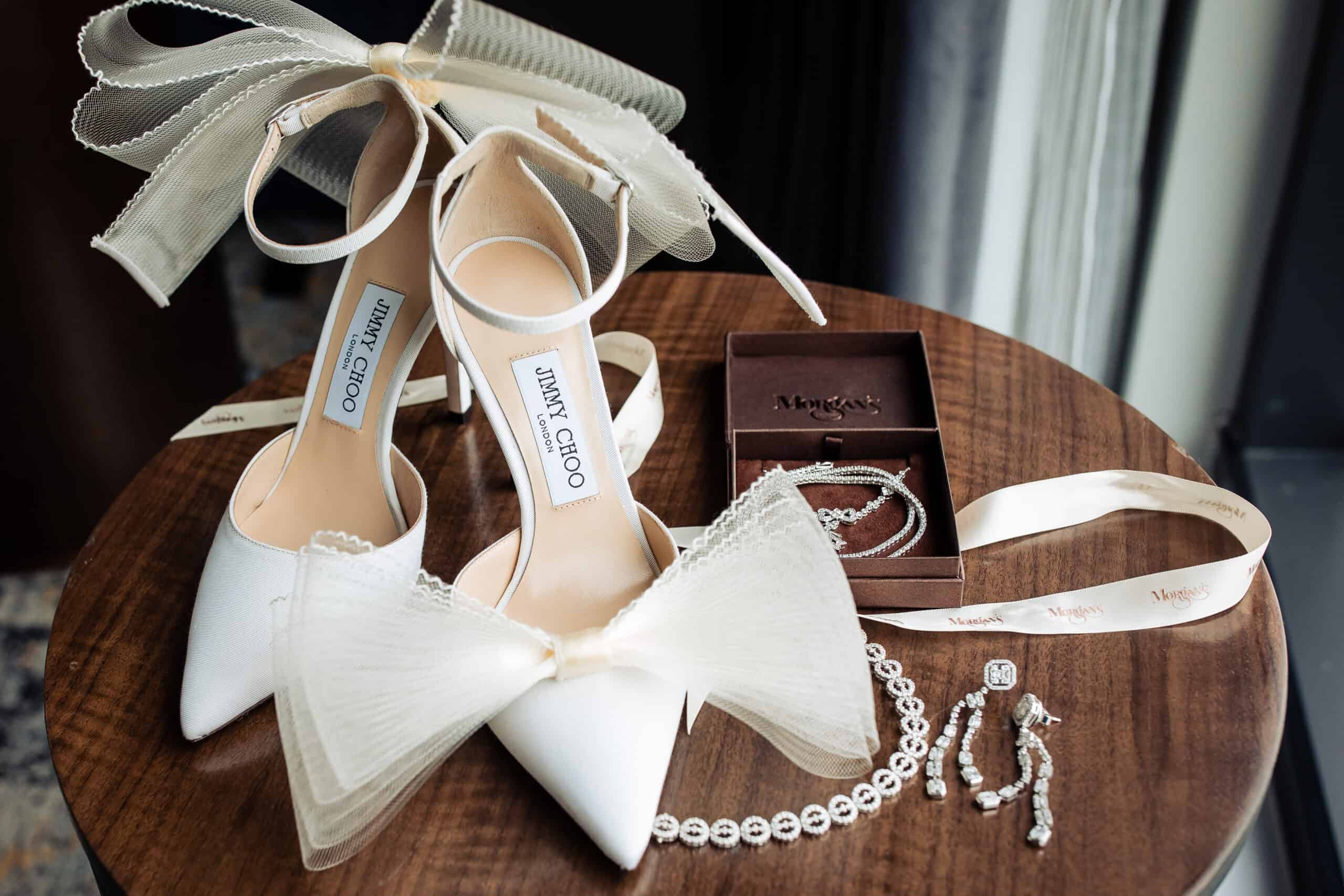 For bridal prep, our team will arrive near the end of your hair and makeup process in order to capture those final touches. During this time, we also take photos of details like your dress or suit, shoes, flowers, jewelry, and other unique items. It’s important to note that the bride should be scheduled to have her hair and makeup done first, that way if it runs late it won’t affect the schedule as much. If need be, you can stage touch ups to photograph when the photographer arrives.